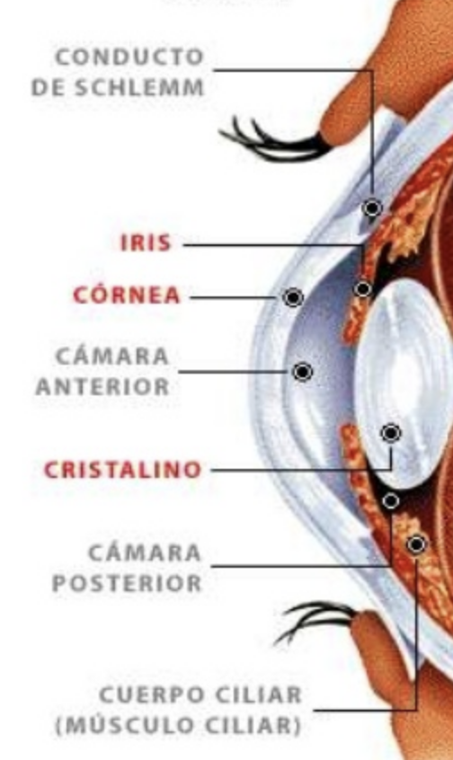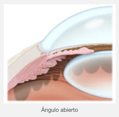 El Angulo Iridocorneal es el que se forma entre el Iris y la Cornea, y en el se aloja el conducto de Schlem que es el encargado de drenar el liquido intraocular hacia afuera del ojo.