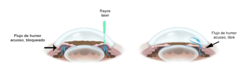 La mas común si el Angulo no es muy estrecho se llama Iridectomia Periferica, que se realiza con un equipo de YAG LASER. La misma si bien no abre el angulo deja una via de escape para el humor acuoso y este logra llegar al canal de Schlem para seguir su camino y que no suba la Presion Intraocular.